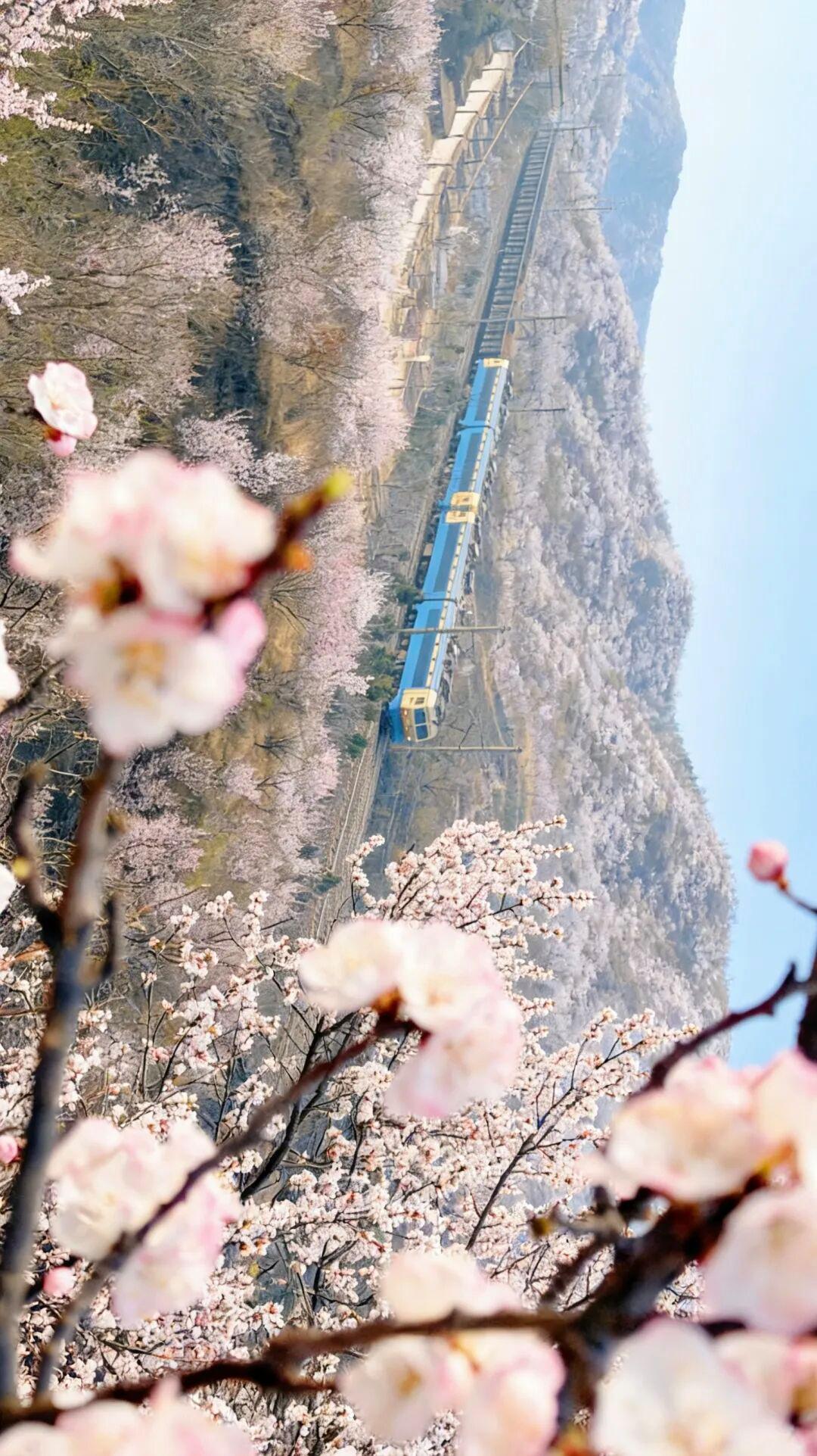 若有幸,还能目睹火车穿行于花海与山岚之间,钢铁的轰鸣声打破了山野的宁静,为这片春色增添了几分生动的气息。